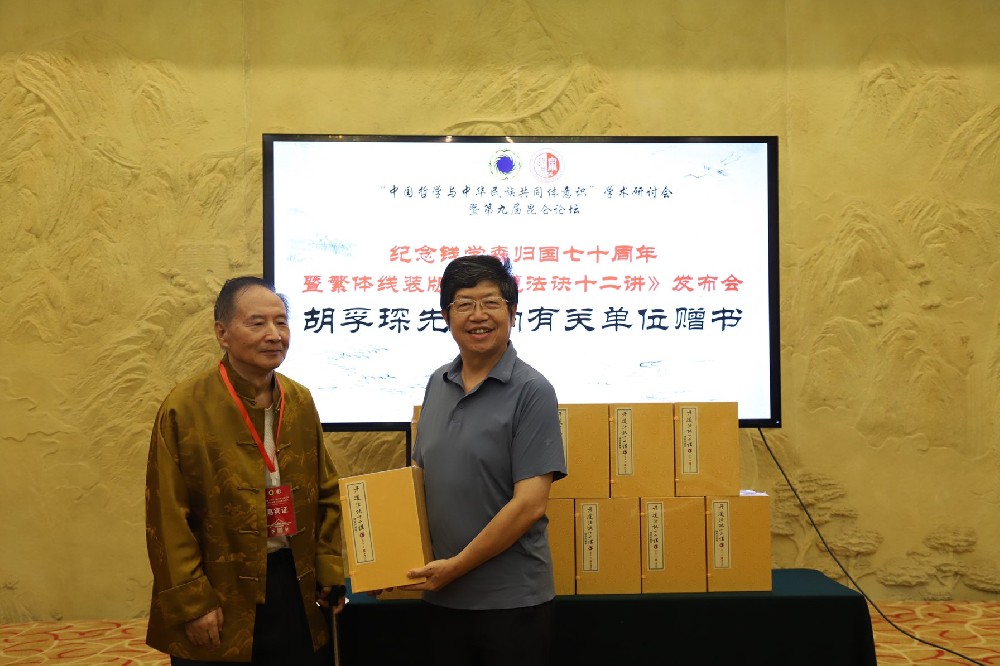 近日,《丹道法诀十二讲》的作者、老子道学文化研究会创会会长、中国社会科学院哲学研究所研究员胡孚琛教授向浙江大学赠送最新出版的繁体线装版《丹道法诀十二讲》,浙江大学哲学院盖建民教授代表浙江大学接受了赠书。 繁体线装版《丹道法诀十二讲》的出版发行,不仅是对钱学森先生归国七十