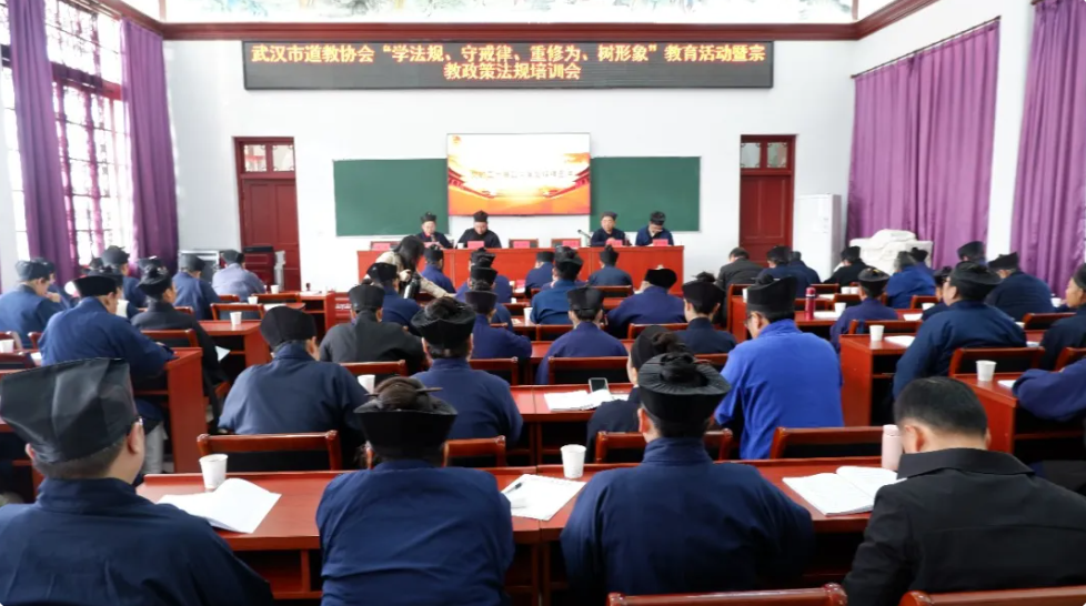 12月19日,武汉市道教协会组织的“学法规、守戒律、重修为、树形象”教育活动及宗教政策法规培训会在武汉长春观道学讲堂顺利举行。武汉市各区道教界代表、武汉长春观全体教职人员共 70余人齐聚一堂,共同学习政策法规,强化戒律意识,提升综合素养。武汉市民宗局相关领导、武汉市道教协会负责人出席会议并讲话,