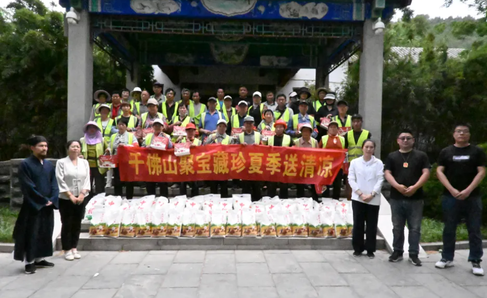 5月12日,千佛山三清观、千佛山景区工作部、济南聚宝藏珍商贸有限公司、山东亿澎电梯有限公司共同举行“夏日送清凉”的慰问千佛山景区园林一线工作者活动。