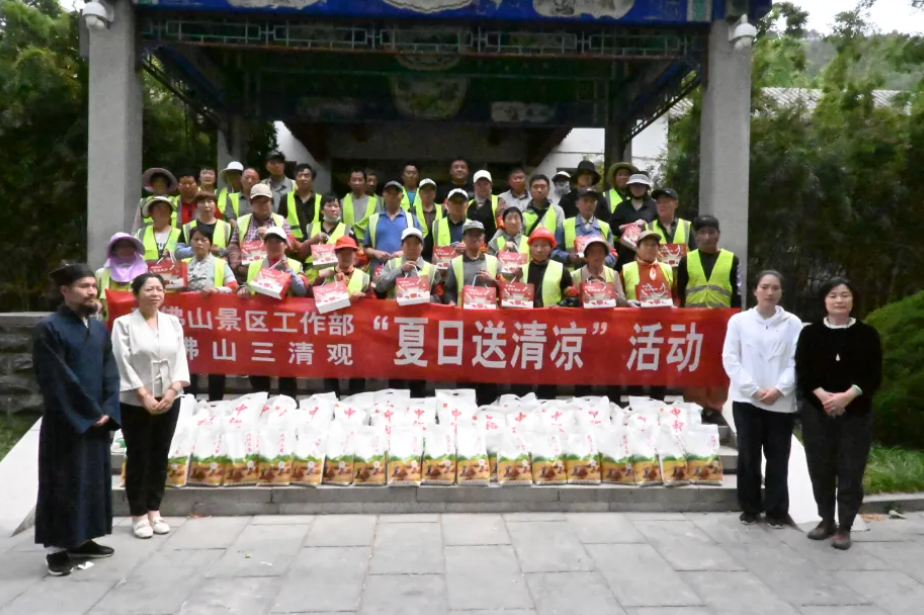 千佛山三清观及相关企业举行“夏日送清凉”——慰问千佛山景区园林一线工作者活动发布时间: 2025-05-14|来源: 中国网道家文化|作者: 佚名|责任编辑: 曹洋5月12日,千佛山三清观、千佛山景区工作部、济南聚宝藏珍商贸有限公司、山东亿澎电梯有限公司共同举行“夏日送清凉”的慰问千佛山景区园林一